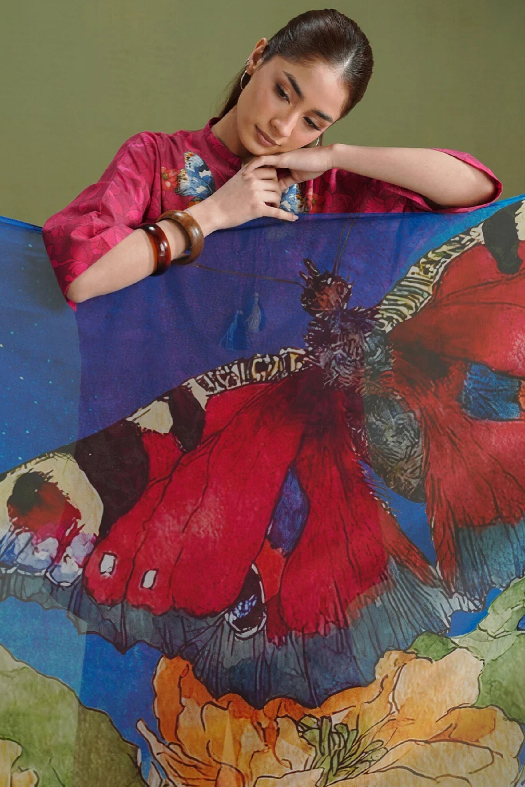 The dupatta showcases watercolor hydrangea florals with butterfly motifs printed in cobalt blue. The shirt and trouser feature coordinated self-floral prints on a cherry red base.