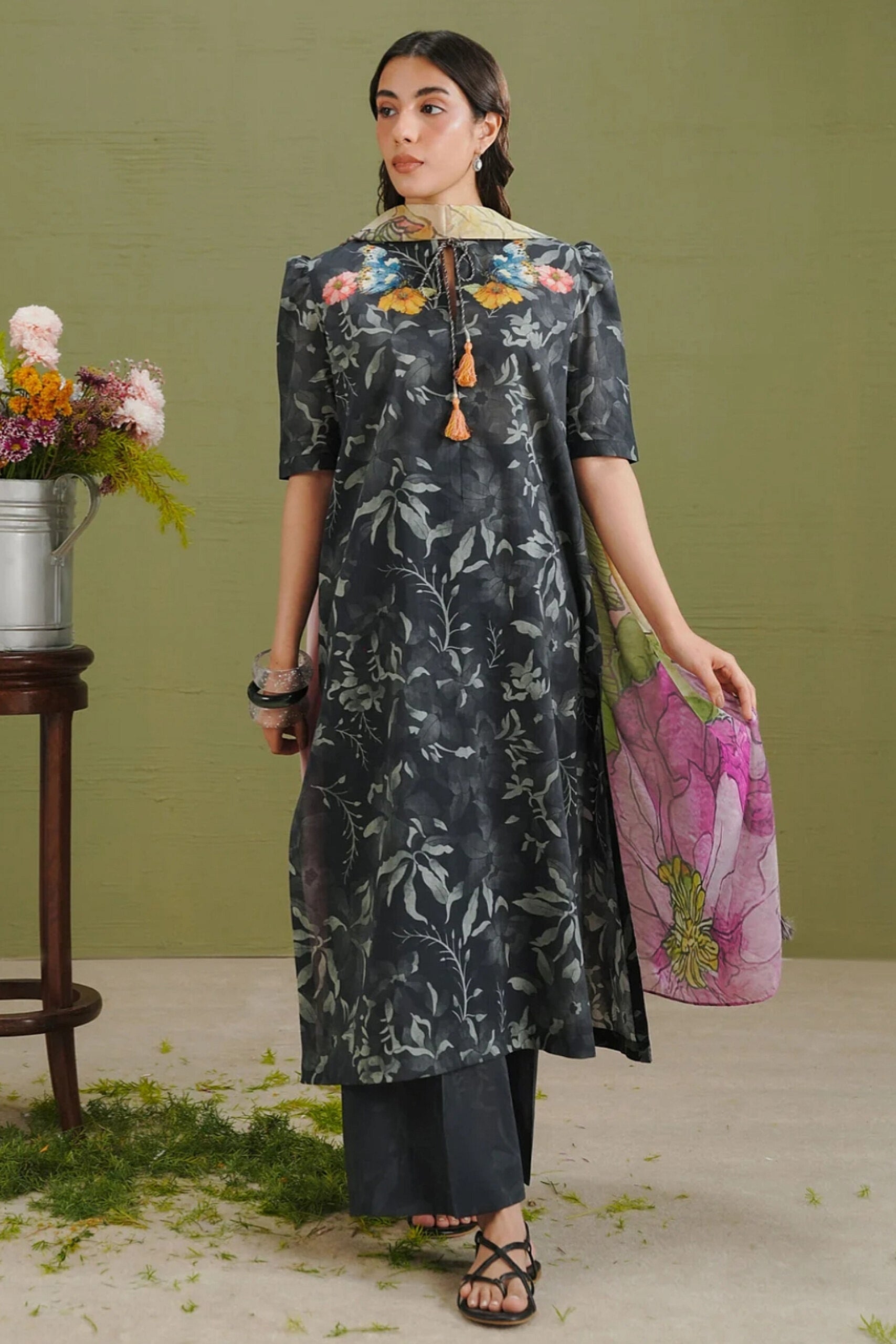 The dupatta features watercolor hydrangea florals with butterfly motifs in powder pink. The shirt and trouser are printed with matching self-floral motifs on a charcoal and black base.