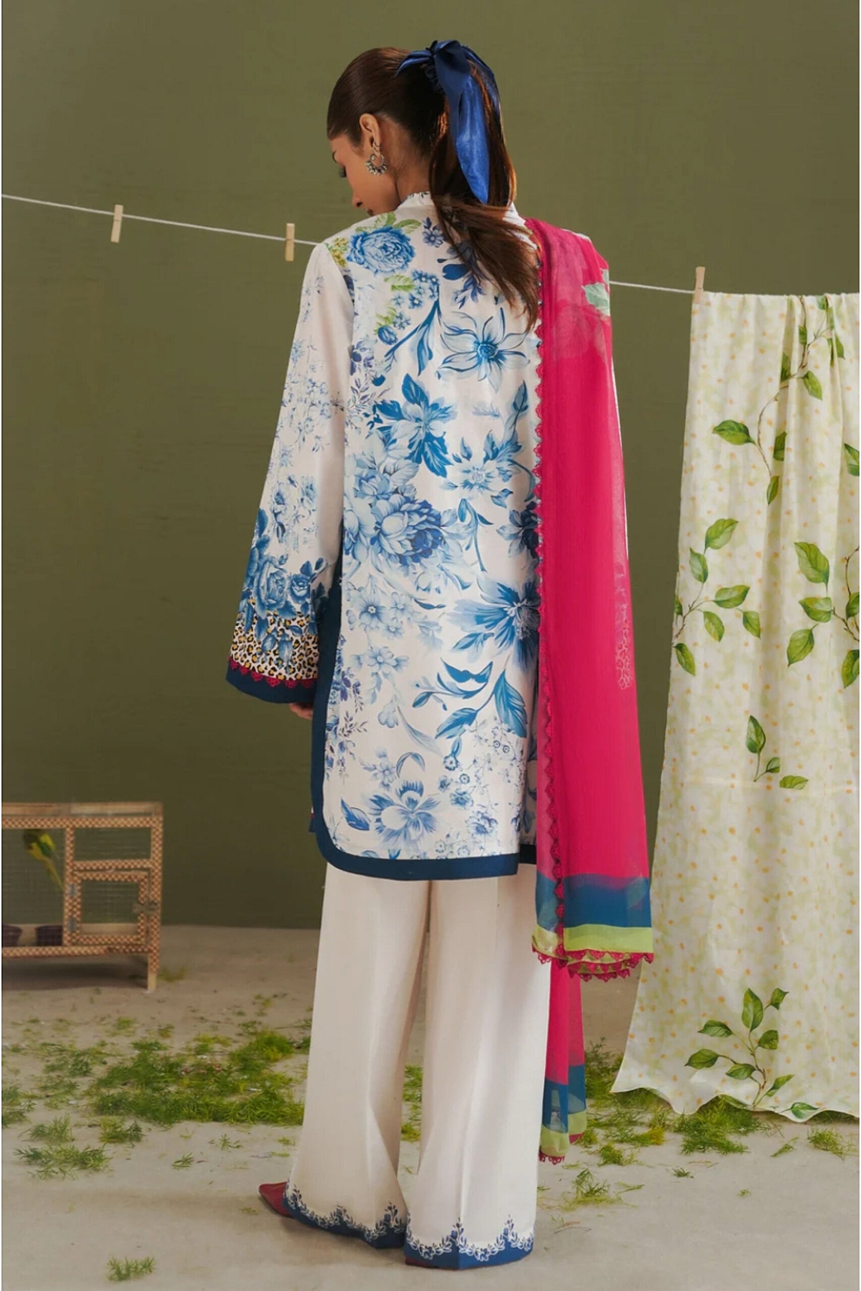 The dupatta is printed with blue roses and finished with blue and olive green borders on a hot pink base. The shirt features blue rose and floral prints on pearl white. The trouser is detailed with a blue scalloped border on pearl white.