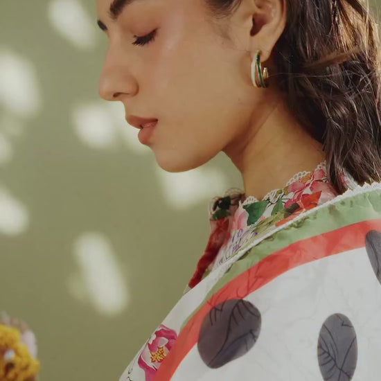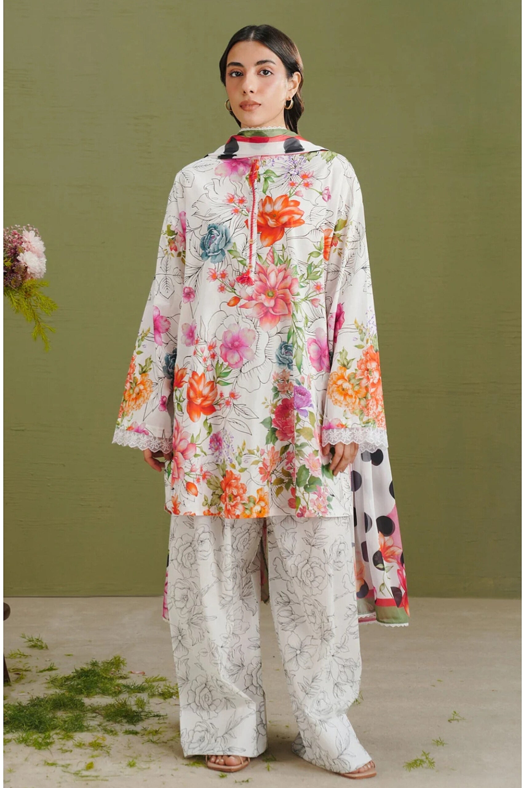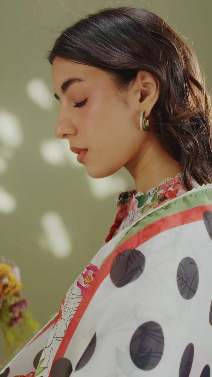 The dupatta is inspired by floral and polka dot elements. The shirt is printed in black and white with colorful floral accents. The trouser feature black and white floral prints to complete the set.