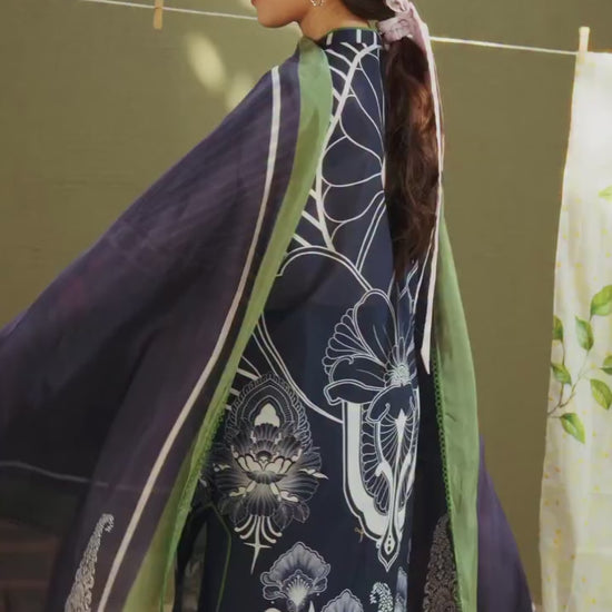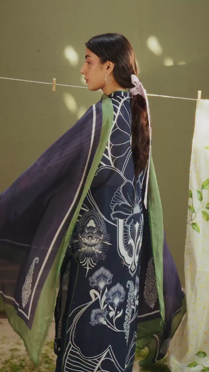 The dupatta is printed in midnight blue with paisley motifs and a moss green border. The shirt features midnight blue and white art nouveau inspired prints. The trouser is finished in solid midnight blue.