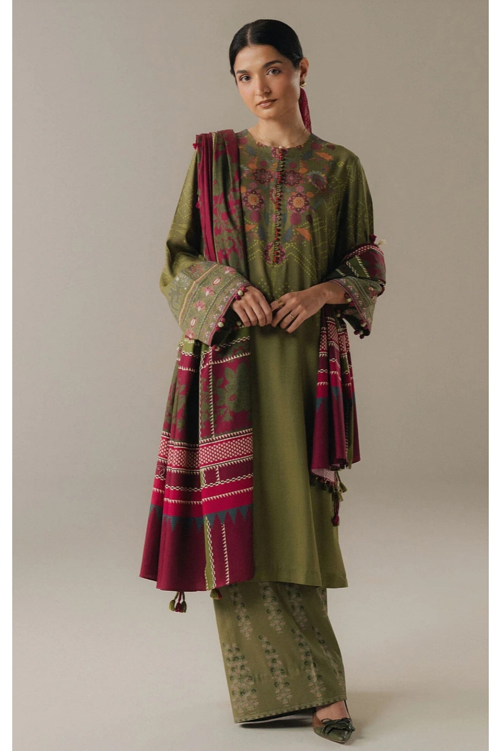 An olive green shirt paired with matching olive green trousers inspired by traditional block print booti motifs. The look is completed with a maroon and olive checked shawl, adding warmth, texture, and a classic touch to the refined earthy palette.