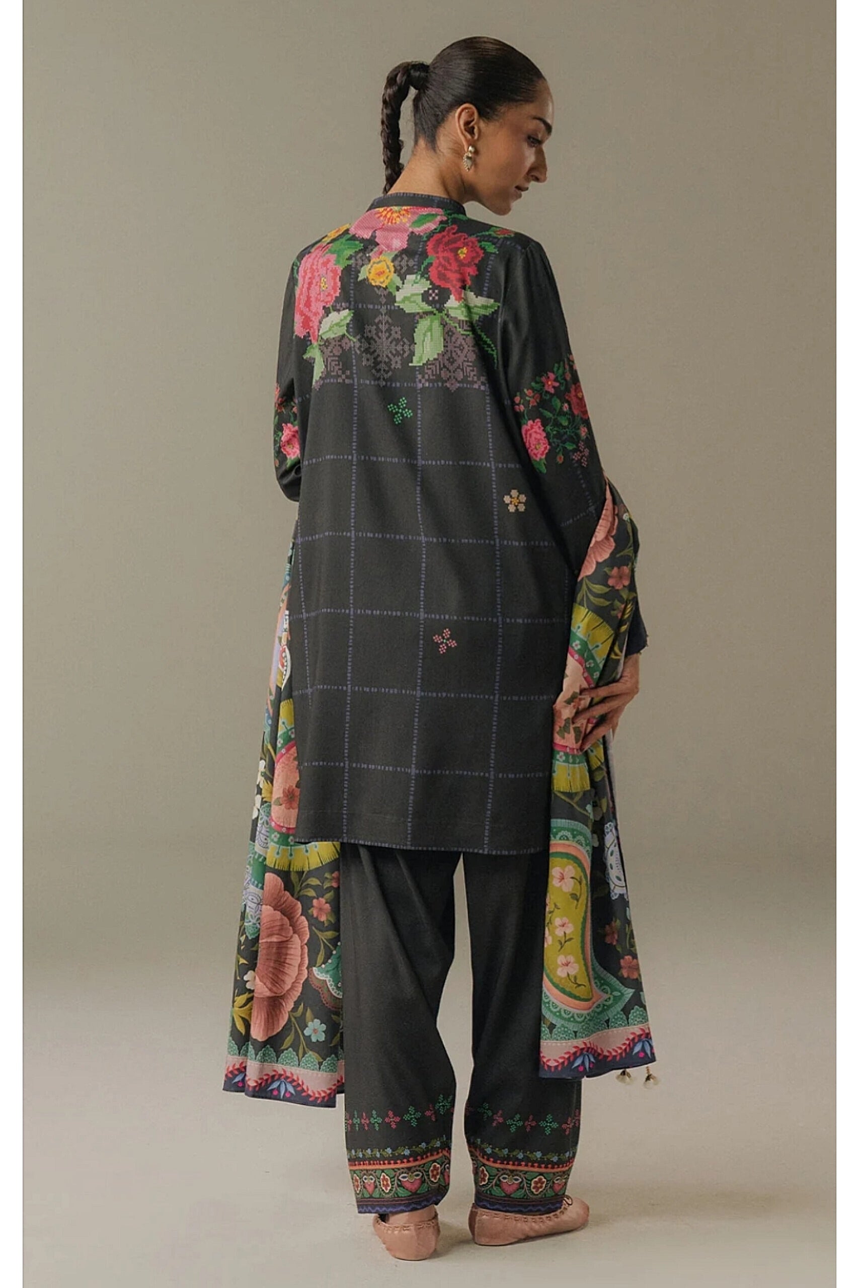 A charcoal shirt inspired by traditional cross-stitch embroidery, paired with matching charcoal trousers for a sleek and cohesive look. The ensemble is brought to life with a bold, colorful paisley shawl that adds vibrance, artistry, and a striking contrast to the deep tones of the outfit.