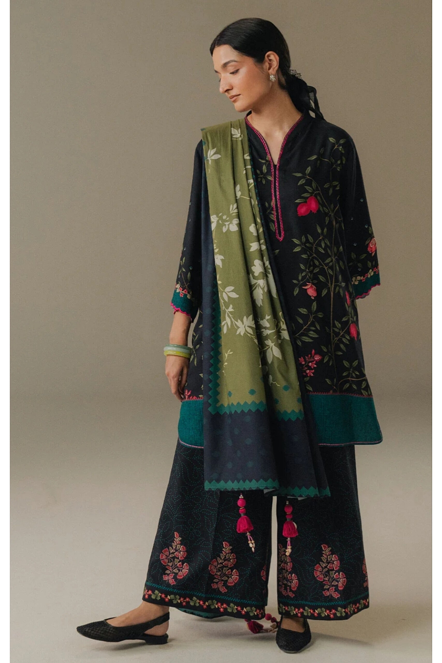 A black shirt inspired by modern chintz patterns, paired with black trousers featuring subtle block print detailing. The look is completed with an olive green and black shawl, adding contrast and depth to this contemporary and elegant ensemble.