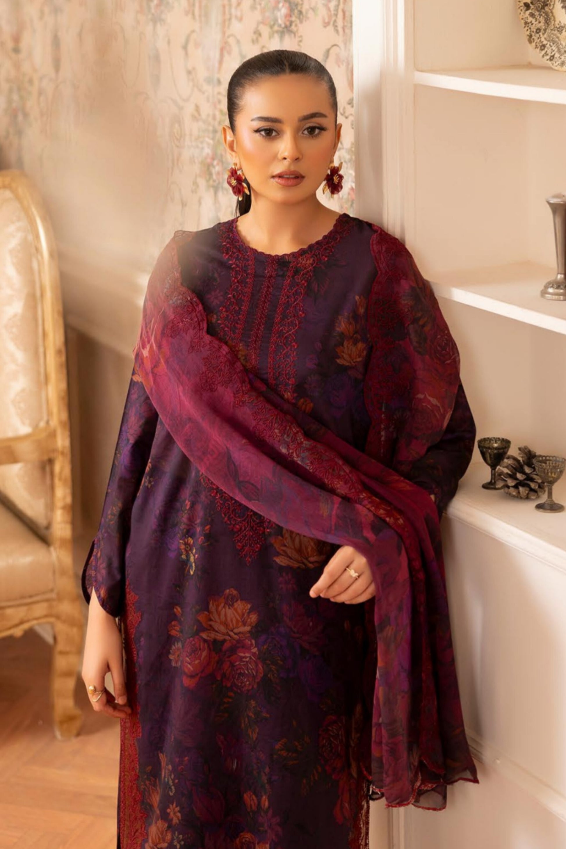 - Duppata:ย Digital Printed Bamber Chiffon Embroidered Cut-Work