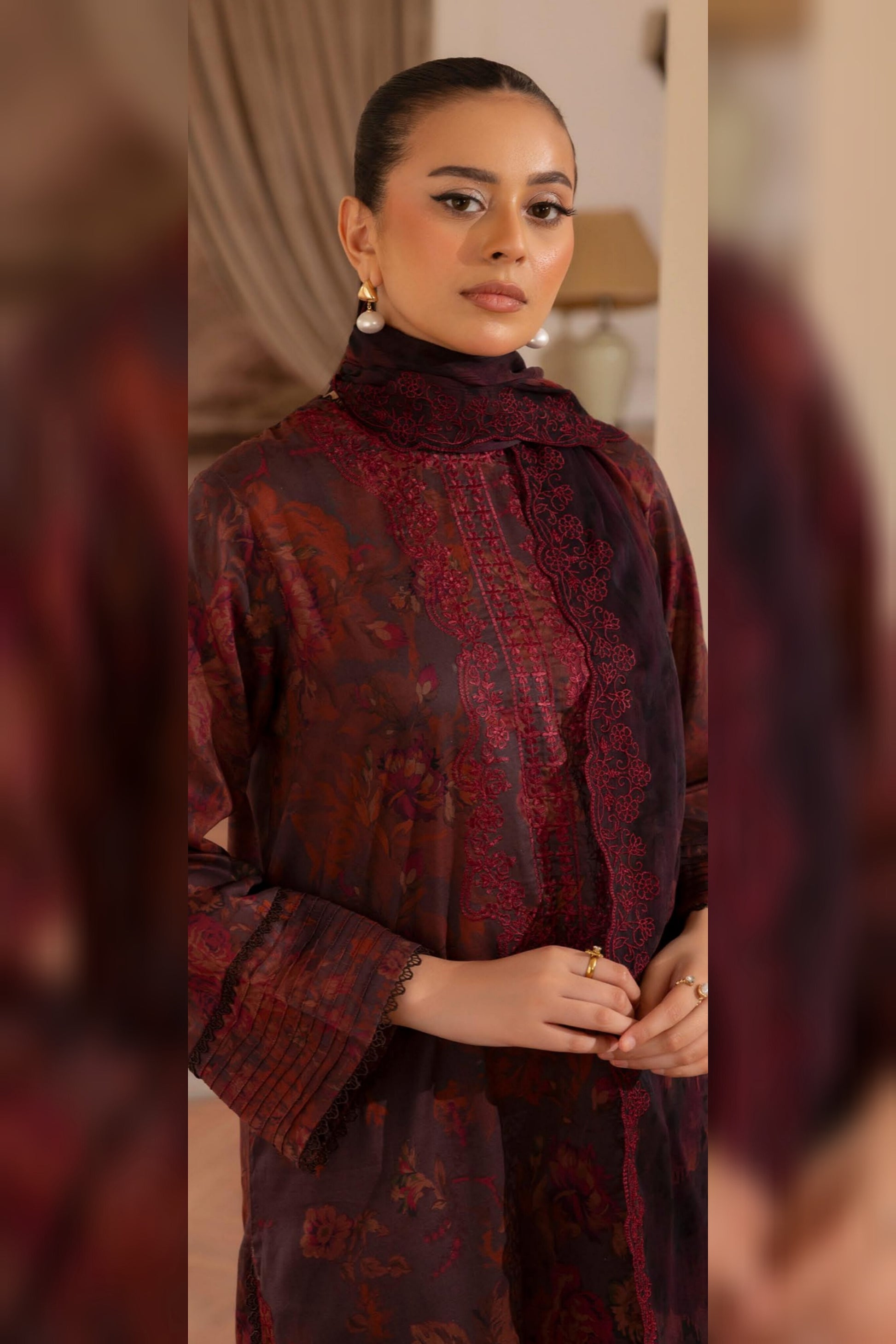 • Duppata:ย Digital Printed Bamber Chiffon Embroidered Cut-Work